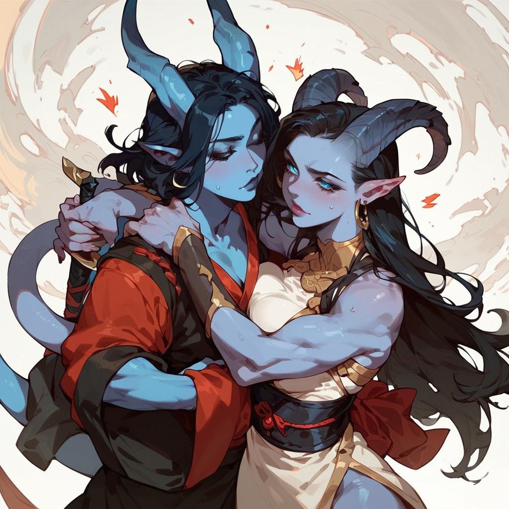 Score_9, score_8_up, score_7_up, tiefling, female, blue_skin, dark_hair, black_sclera, muscular, samurai, twisted horns, holding a sword