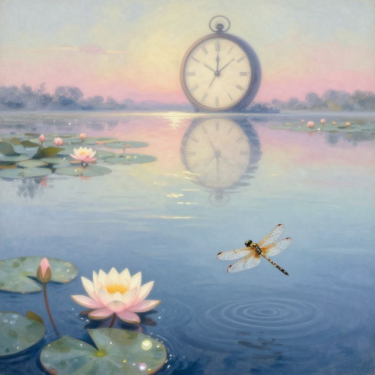 A captivating blend of impressionistic water lilies and surreal dreamscapes emerges in this enchanting scene: soft, delicate brushstrokes evoke the tranquility of floating lily pads and shimmering waters, while an imposing timepiece looms in the distance, its distorted reflection casting an air of mystery upon the tranquil surface. An exquisite dragonfly, with intricate wings reminiscent of Japanese ukiyo-e prints, hovers gracefully near the water's edge, further enhancing the ethereal atmosphere. Gentle ripples of diffused light dance across the pond, meeting the dreamlike horizon and evoking a serene yet thought-provoking emotional resonance.