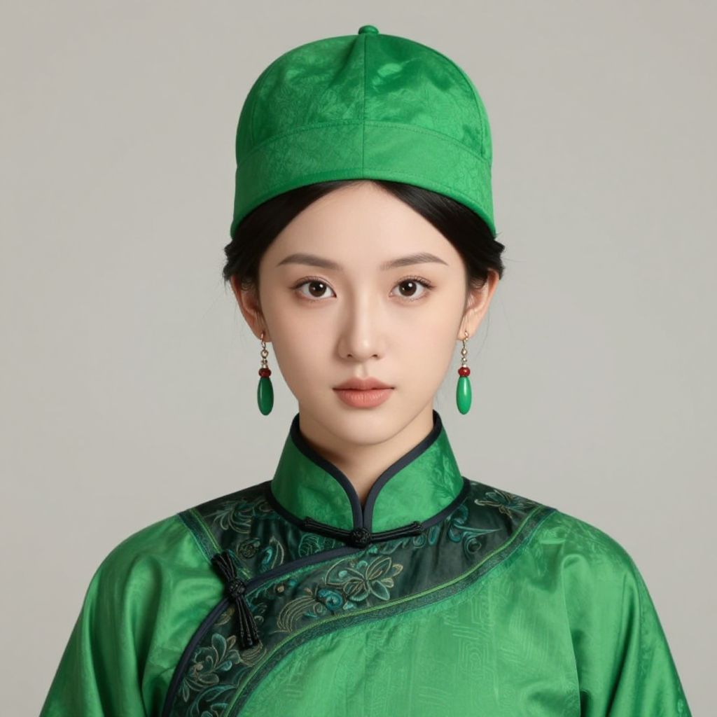Green card costume, 1girl, solo, earrings, jewelry, realistic, black hair, looking at viewer, upper body, green headwear, chinese clothes, simple background, hat, lips