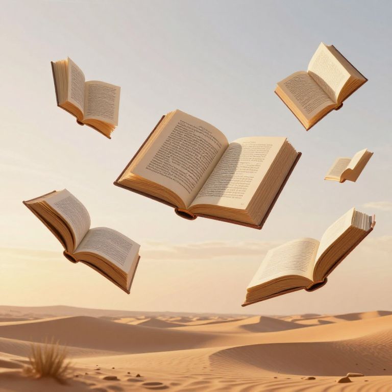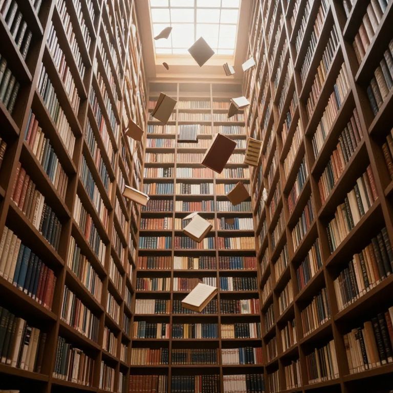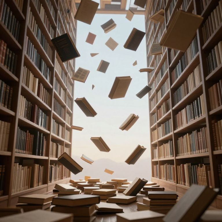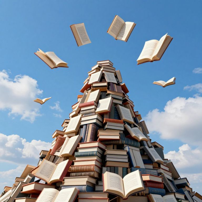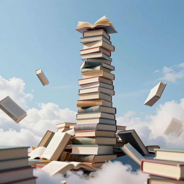 Books tower skyward in a spiraling mountain, their pages fluttering as if alive, surrounded by airborne volumes and wisps of clouds against a serene azure backdrop.