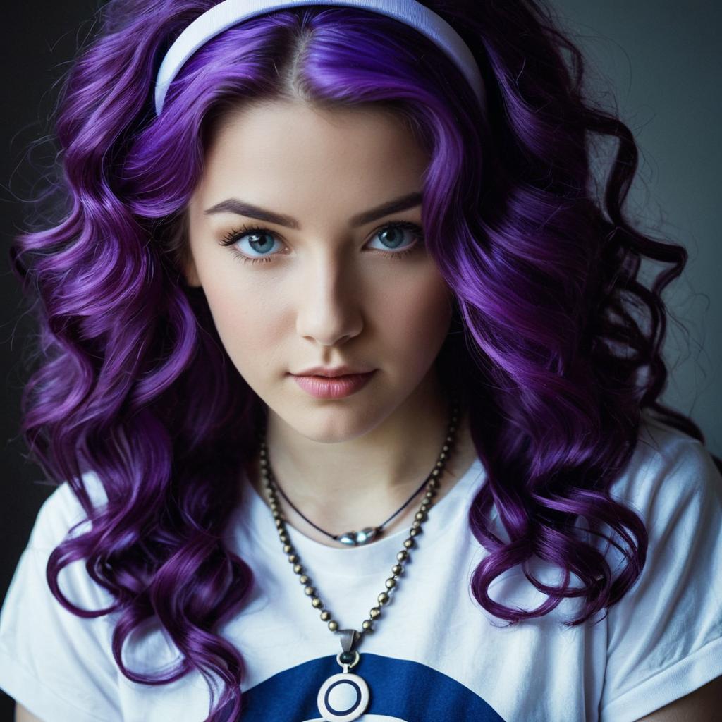 Pokemon violet hairstyle,1girl, solo, jewelry, long hair, necklace, hairband, realistic, purple hair, blue eyes, looking at viewer, upper body, wavy hair, shirt, lips, curly hair