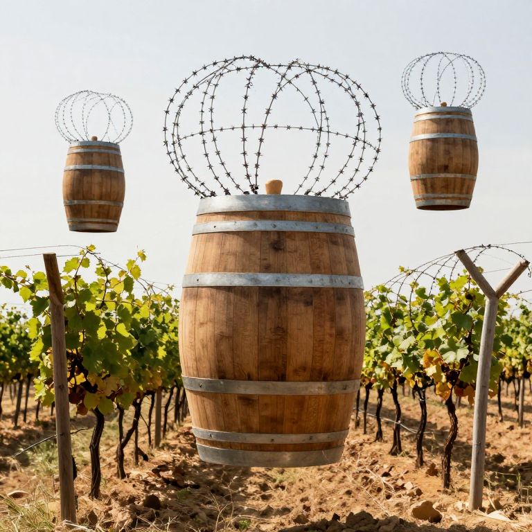 Floating barbed wire vineyards twist around levitating wine barrels, producing nectar of paradoxes that taste of forgotten memories.
