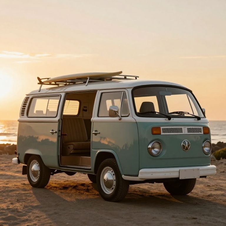 Amidst the golden glow of sunset, a classic Kombi stands as a beacon of freedom and wanderlust, its open doors and surfboard hinting at untamed adventures and the timeless pursuit of serenity by the sea.