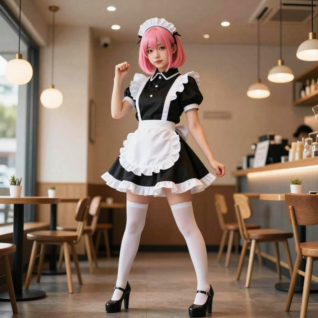 Maid heels, sleek and stylish, featured in a modern anime-style maid outfit, vibrant colors, dynamic pose in a cozy cafe background with soft blurred lights