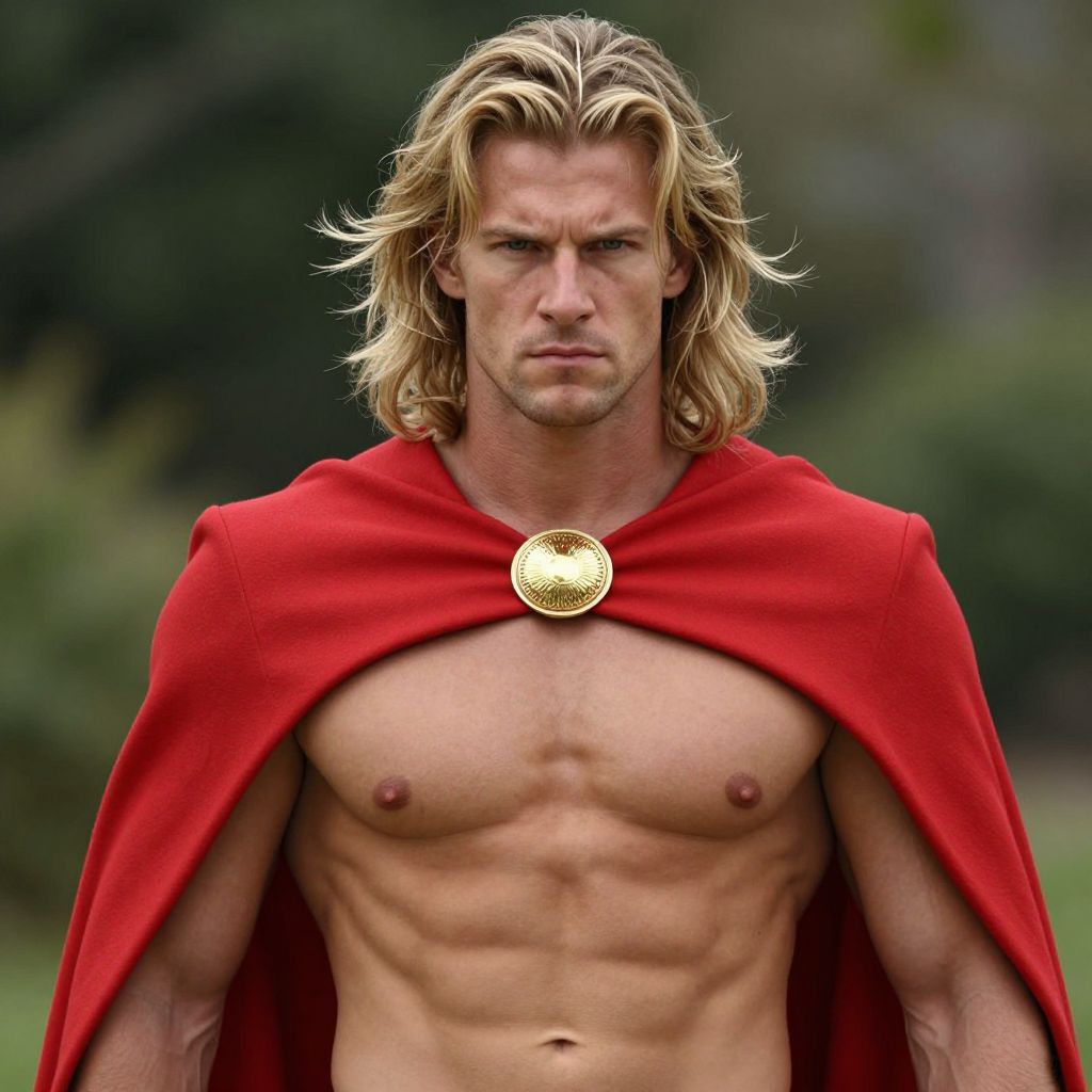 Photograph of a muscular, blond-haired man with a serious expression, standing outdoors. He's wearing a bright red cape with a gold brooch at the center, draped over his bare, defined chest. His hair is shoulder-length and slightly windswept. The background is blurred greenery, making him the clear focus. The lighting highlights his strong, sculpted physique and intense gaze.