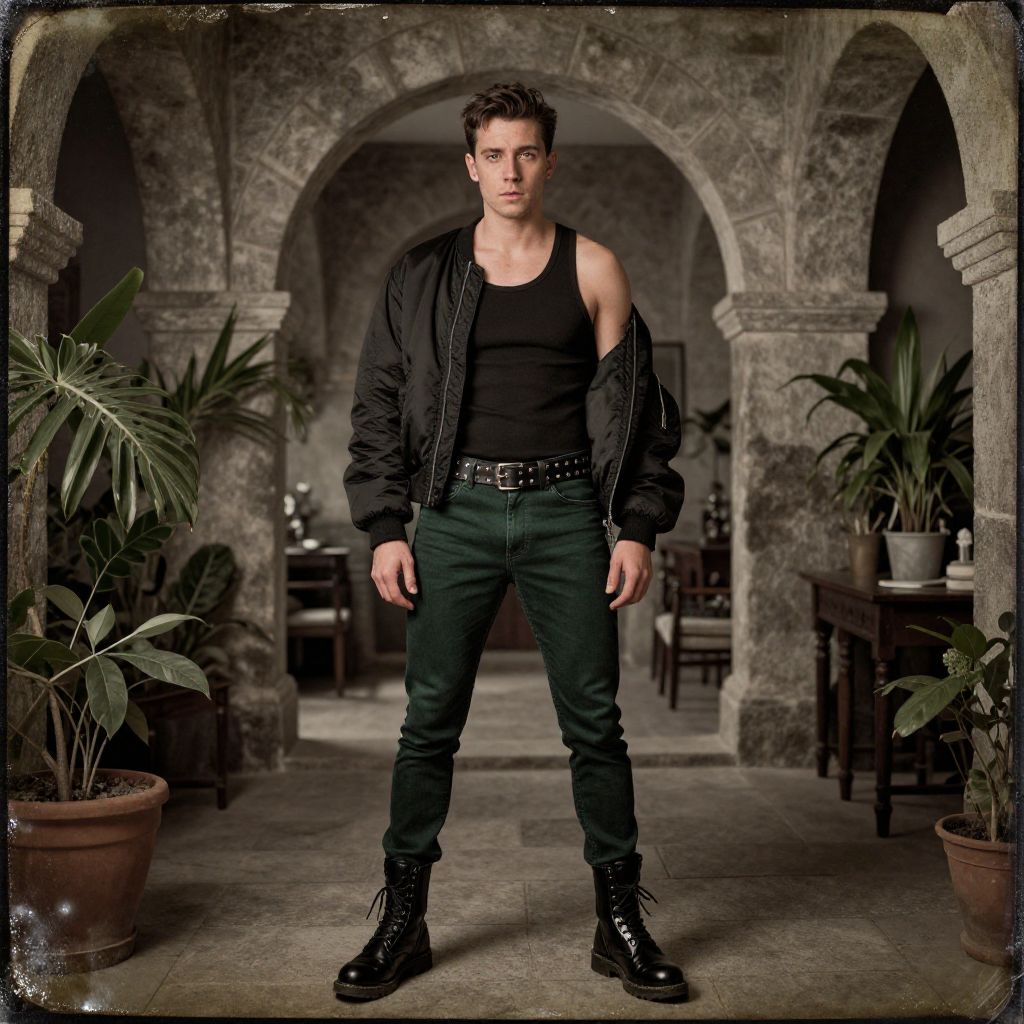 A man, glossy black combat boots, dark green skinny jeans, fitted black tank top, oversized black bomber jacket, studded leather belt, historic stone arches, quiet study nooks, lush indoor gardens, collodion wet plate style, contemplative expression Man has masculine face and piercing eyes