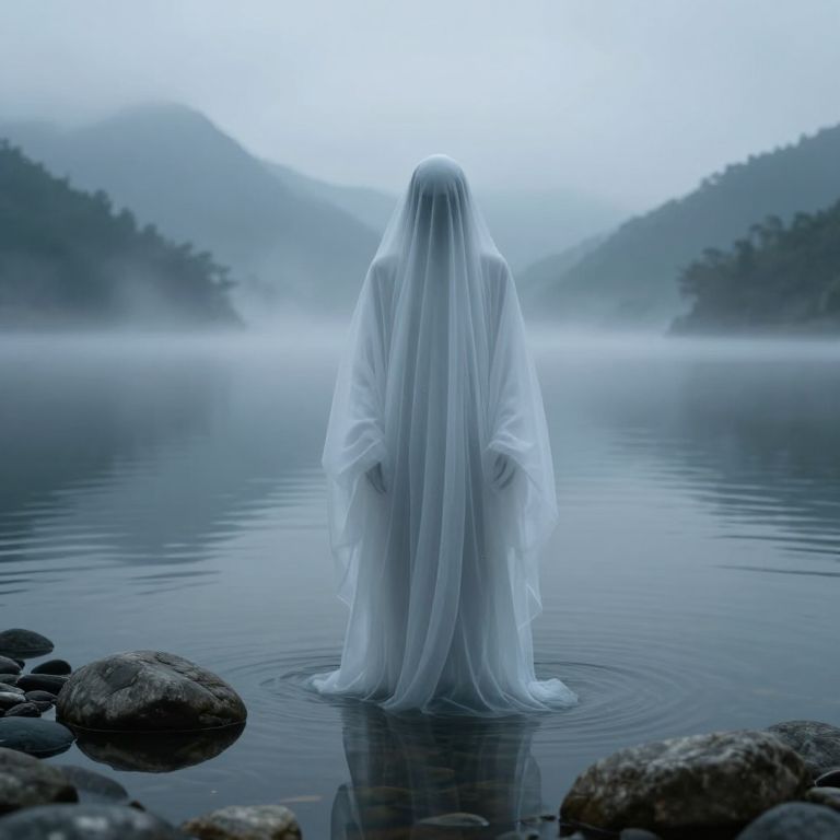 Photograph of a mysterious, ghostly figure standing waist-deep in a calm, misty lake. The figure is enveloped in a long, flowing white sheet, obscuring all details of their body and face. The background features mist-covered, forested hills on either side of the lake, creating a serene yet eerie atmosphere. The water is still, reflecting the pale blue-gray sky, with a few rocks visible at the edge of the lake in the foreground. The overall color palette is cool and muted, dominated by whites, blues, and grays, enhancing the ghostly, otherworldly effect.
