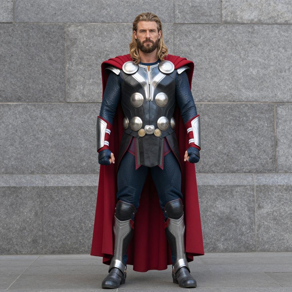 Premium thor costume, photo of handsome man with long blonde hair, beard, superhero costume, standing in front of gray stone wall, wearing black and silver armor with round metallic plates, red cape, serious expression, daytime, realistic, full body shot, studio lighting, cinematic style, detailed ures on armor and cape