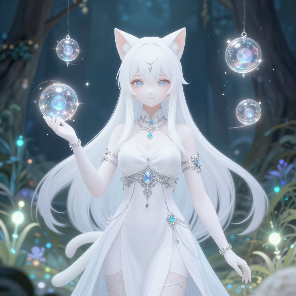 Anime white cat girl with elegant fantasy attire, surrounded by magical floating orbs, intricate silver jewelry, ethereal forest setting with glowing plants, mystical and enchanting ambiance