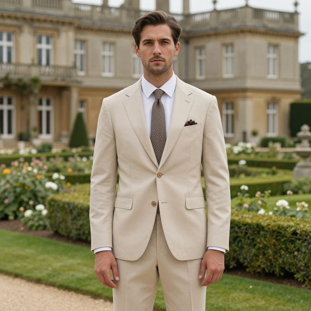 A stylish man dressed in a light beige suit stands confidently in a lush garden setting. The elegant backdrop of a historic manor adds charm to the scene, showcasing a serene and sophisticated outdoor atmosphere.