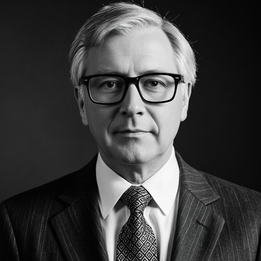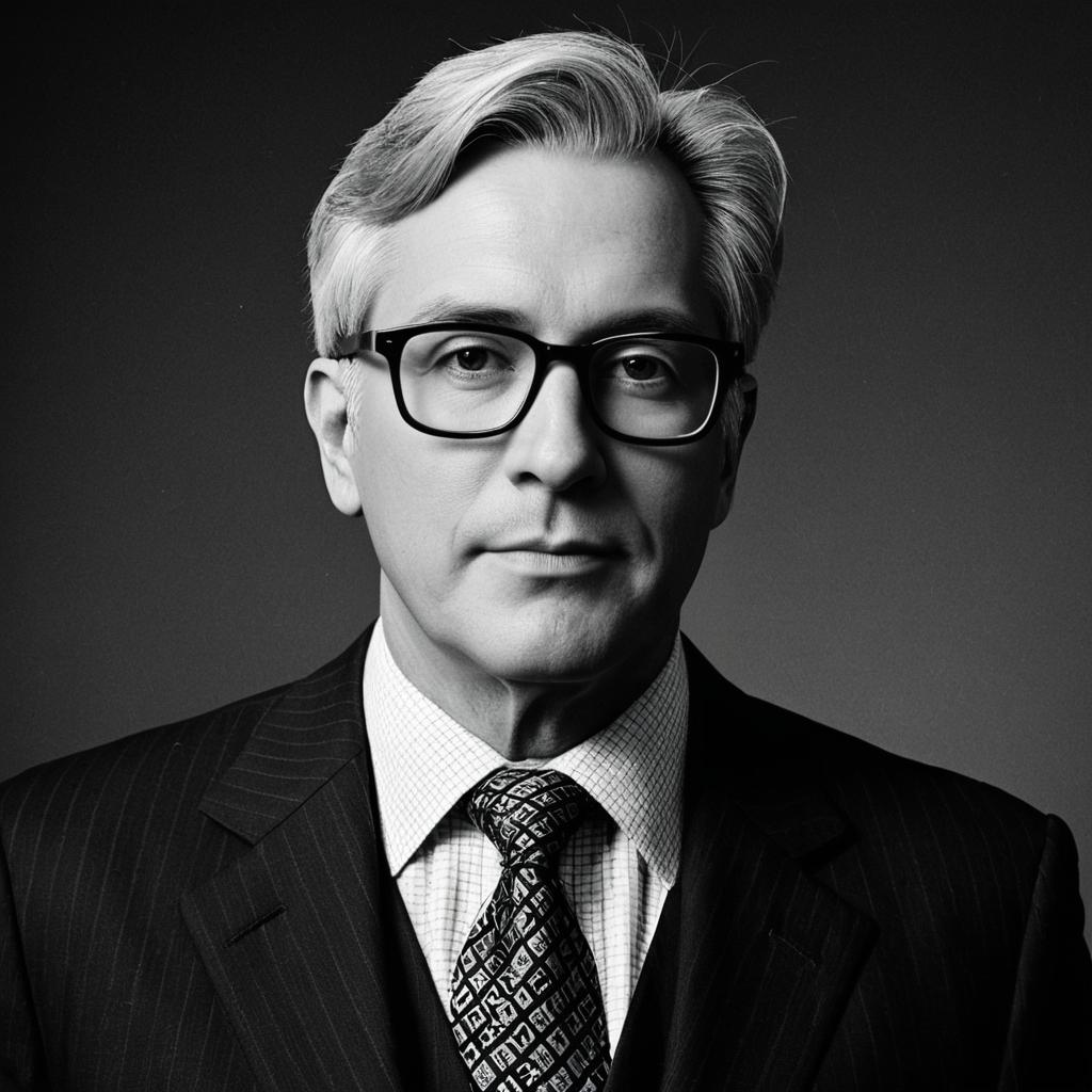 Uncle Tom Wood cosplay, Hi, Mom! Paul Bartel, adult male character cosplay, short gray hair, square glasses, dark conservative suit, patterned necktie, classic style, monochrome background