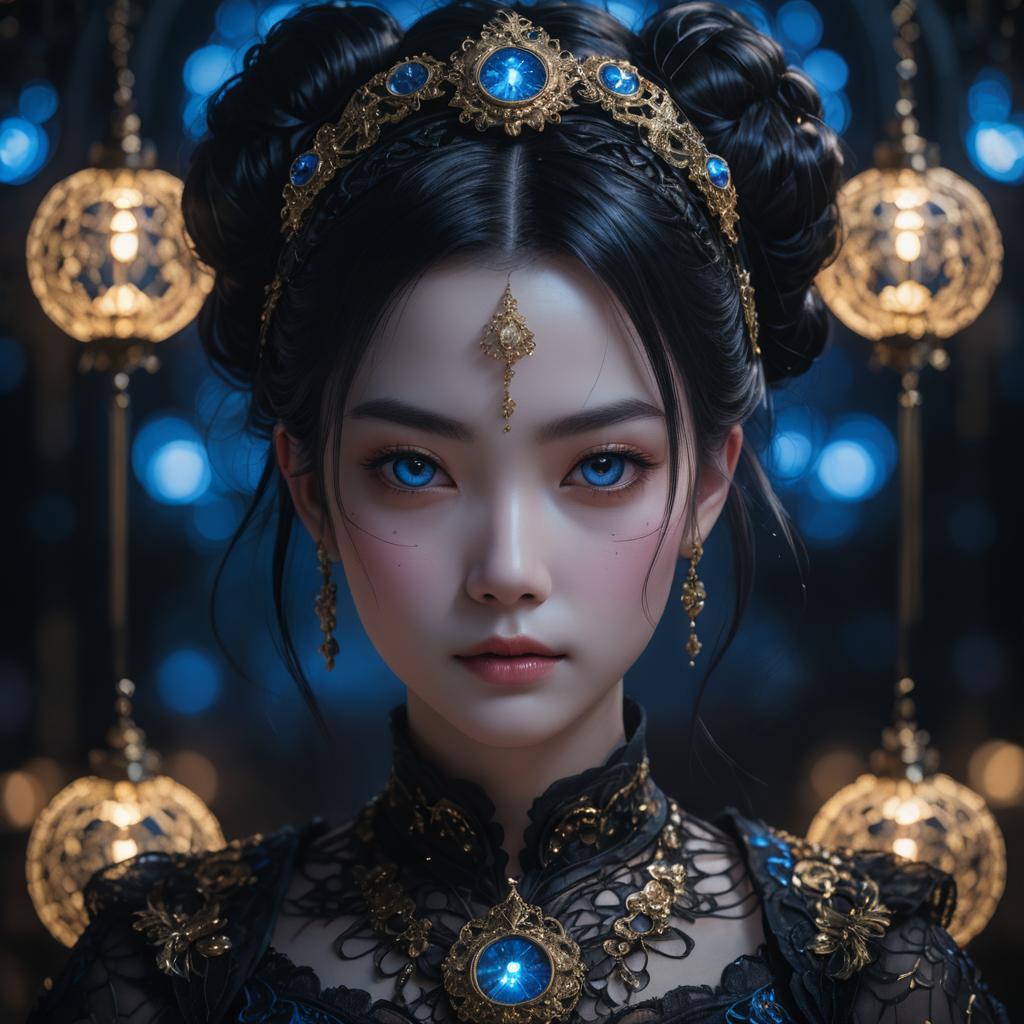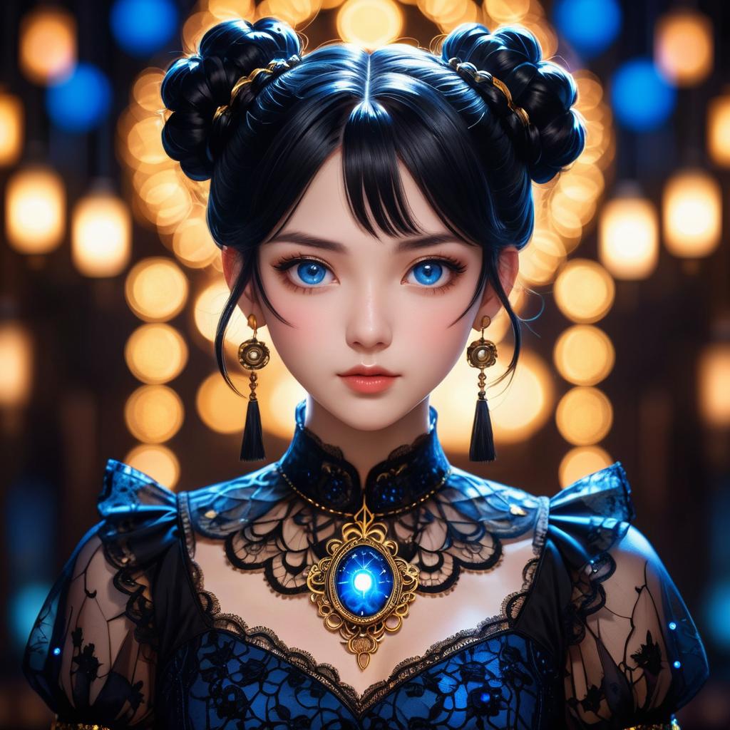 A detailed anime portrait of a young woman with striking blue eyes and black hair styled in double buns, wearing an intricate black lace dress adorned with glowing blue and gold jewelry, warm glowing bokeh lights in the background, dramatic high contrast lighting, dark fantasy atmosphere