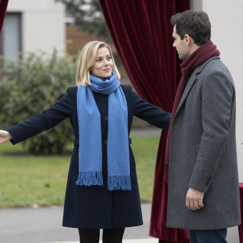 Photograph of two people outdoors. A blonde woman with short hair, wearing a blue scarf and dark coat, stands with arms outstretched in front of a red velvet curtain. A dark-haired man in a gray coat and maroon scarf stands to her right, looking at her. Greenery and a building are in the background.