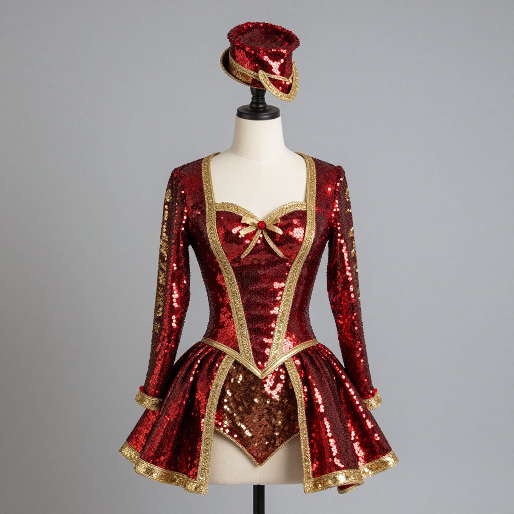 Sequin Circus Costume, dressed in a red and gold outfit and hat