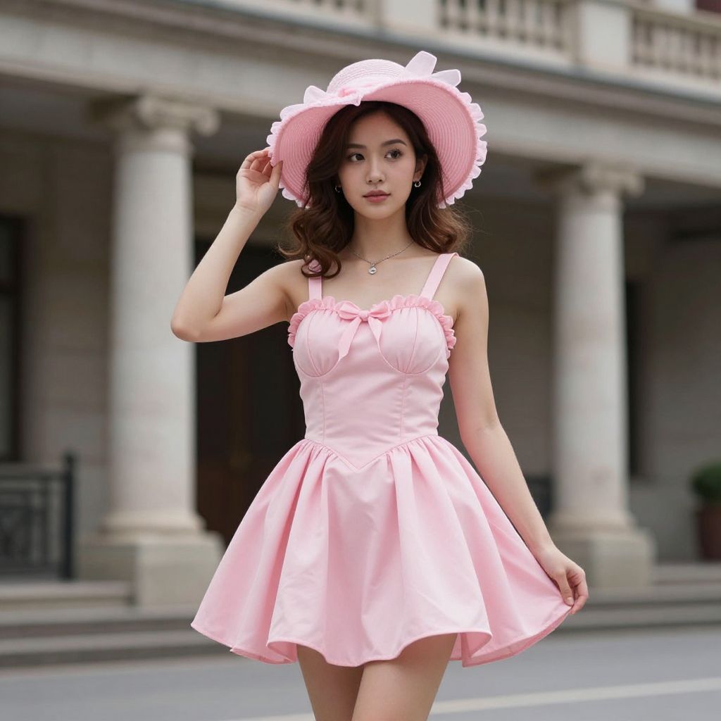 Photograph of an Asian woman with fair skin and wavy brown hair, wearing a pink, sleeveless, sundress with a ruffled neckline and waist, and a matching wide-brimmed pink hat with ruffled edges. She is standing on a city street with classical architecture in the background, featuring white columns and a balustrade. Her right hand gently adjusts her hat while her left hand rests on her hip. She wears a delicate necklace with a small pendant. The dress has a flared skirt, and the overall scene is bright and daytime.