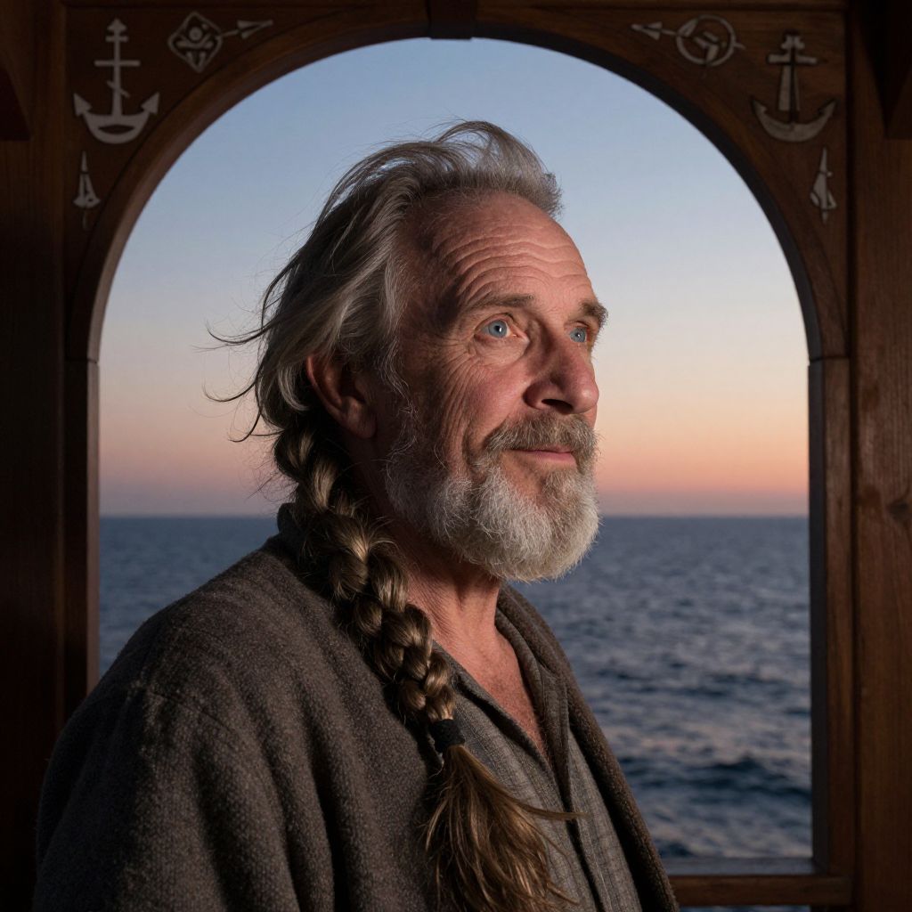 Envision a captivating portrait of an old-fashioned fisherman with distant blue eyes and graying hair in a long braid. His pensive gaze, softened by a gentle smile, invites viewers to connect with his timeless wisdom as he stands between the vast sea and serene sunset sky. One side of his rugged face is illuminated, casting dramatic shadows on his lined skin and highlighting the texture of his coarse beard. Framed within an intricate wooden archway adorned with nautical motifs, the fisherman's introspective pose exudes resilience.