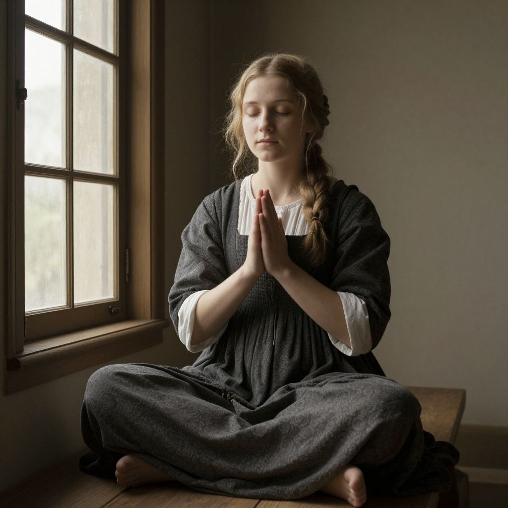 Photograph of a young Caucasian woman with light skin and long, brown, braided hair, sitting cross-legged on a wooden floor in front of a window. She wears a dark, textured, medieval-style dress with white, ruffled sleeves peeking out. Her eyes are closed, and her hands are pressed together in a prayer position. The window to her left lets in soft, natural light, casting subtle shadows. The background is a plain, beige wall, emphasizing the serene, contemplative atmosphere. The image evokes a sense of quiet reflection and devotion.
