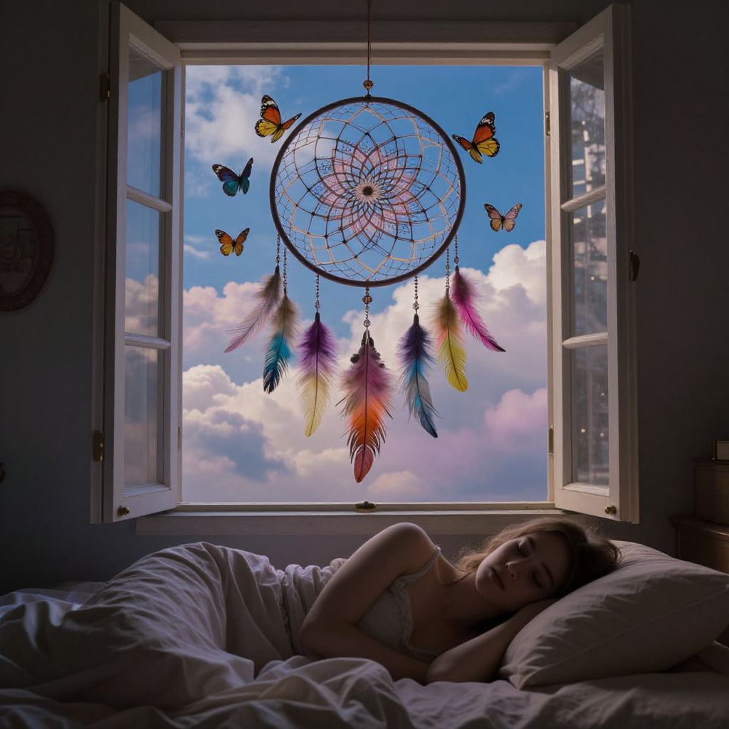 In this ethereal scene, a young woman lies peacefully in bed, her head cradled by a soft pillow. The room is dimly lit, creating a serene and tranquil atmosphere. A dreamcatcher, adorned with intricate patterns and colorful feathers, hangs gracefully from the window, serving as a portal to a fantastical world. Through the dreamcatcher, a vibrant sky unfolds, filled with fluffy clouds and a multitude of butterflies, their wings a mix of delicate hues. The clouds are a soft, fluffy white, contrasting beautifully with the deep blue of the sky. The butterflies, in shades of orange, yellow, and pink, add a touch of whimsy and magic to the scene. The window itself is open, allowing the dreamcatcher to float freely, as if suspended in mid-air. The overall composition is balanced, with the dreamcatcher and the woman's head forming a harmonious focal point. The interplay of colors, textures, and shapes creates a sense of depth and dimension, inviting the viewer to lose themselves in the dreamlike quality of the image.