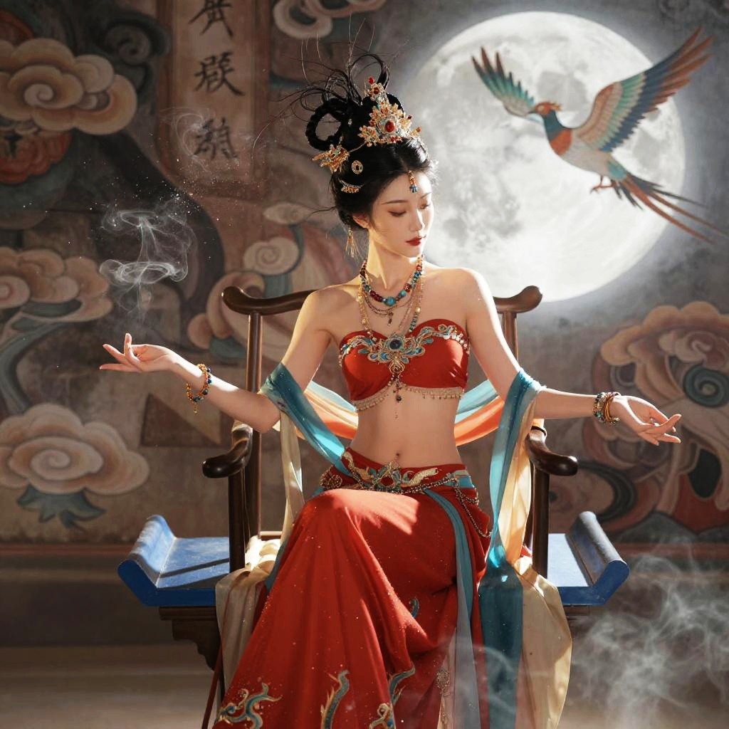 (a woman in a red Dunhuang Flying Apsaras costume sitting on a blue bench, gorgeous chinese model, ceremonial clouds, beautiful fashion model body, royal bird, inspired by Huang Ding, wood chair, thin waist, bust with a long beautiful neck, charismatic beautiful, thin-waist, empress), Dunhuang Flying Apsaras costume, messy long hair, Ji Jian, Dunhuang style, a lot of smoke, superb, elegant colors, (realistic, high detail, masterpiece, super detailed, dynamic angle, mural background, ink wash, amazing, movie lighting, illustration, chiaroscuro, backlighting, god rays, holland, best quality, best quality), ((Chinese style:1)), moon, Beautiful lighting among background, Floating colorful sparkles (1) illuminate her glowing skin against the cosmic backdrop