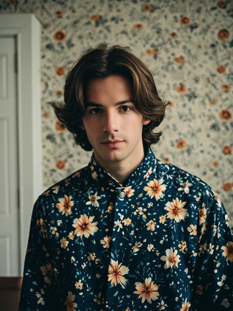 Sky costume adult, 1boy, male focus, looking at viewer, solo, blurry, brown hair, floral print, indoors, blurry background, closed mouth