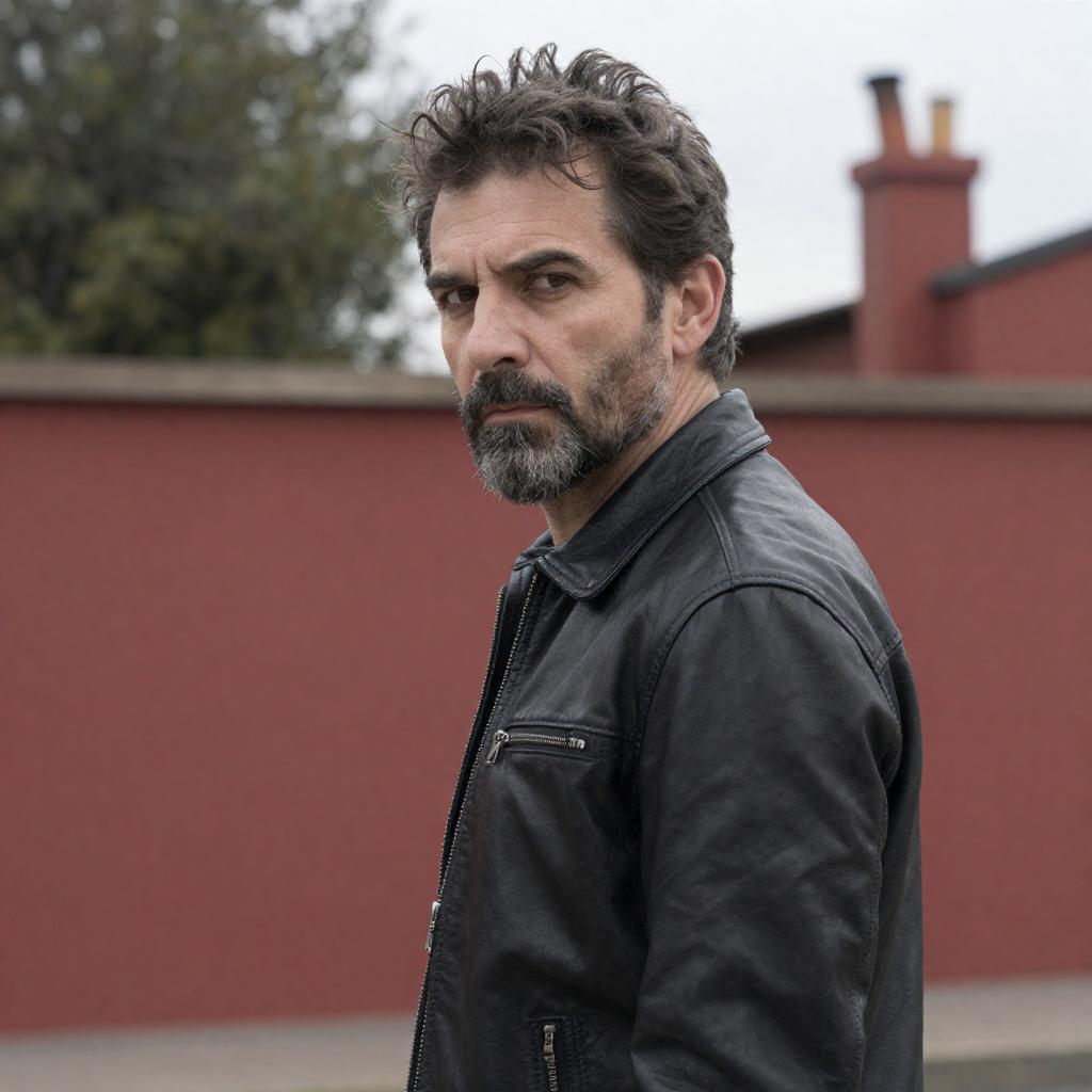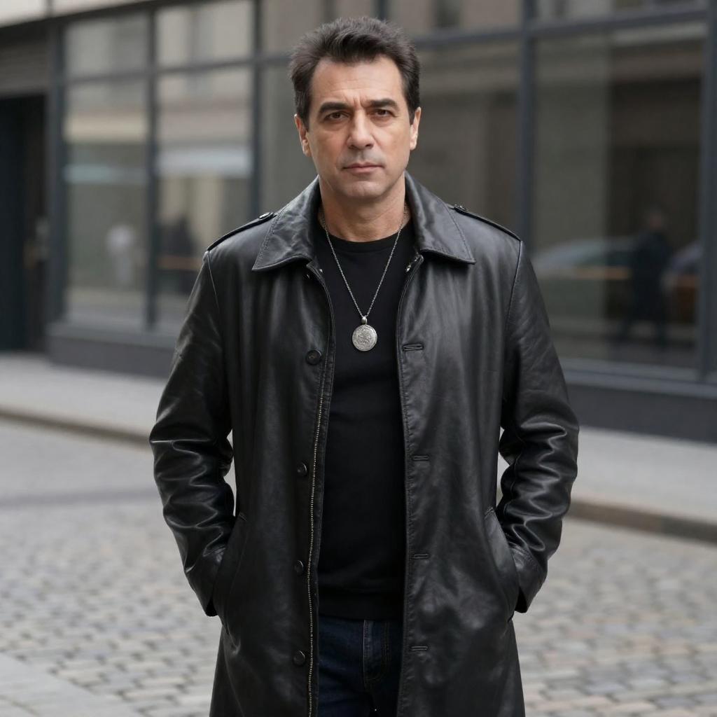 Adult Levantine man in his early 40s with short salt-and-pepper curly hair, neatly trimmed goatee, warm olive skin and broad shoulders, standing casually with hands in pockets, looking toward the horizon with a faint closed-mouth smile, in misty early morning urban park with soft volumetric light, wearing layered urban streetwear (tapered charcoal trousers, long camel wool overcoat with leather elbow patches, patterned wool scarf tucked into the collar, suede chukka boots), closed-mouth smile, subtle makeup, faint goosebumps in crisp golden sunlight, photorealistic, ultra detailed skin, uhd hdr 8k, dslr film photography, 35mm prime, shallow depth of field, film grain, studio quality optics, volumetric light, extremely detailed background, natural color grading, soft bokeh, editorial street photography vibe.