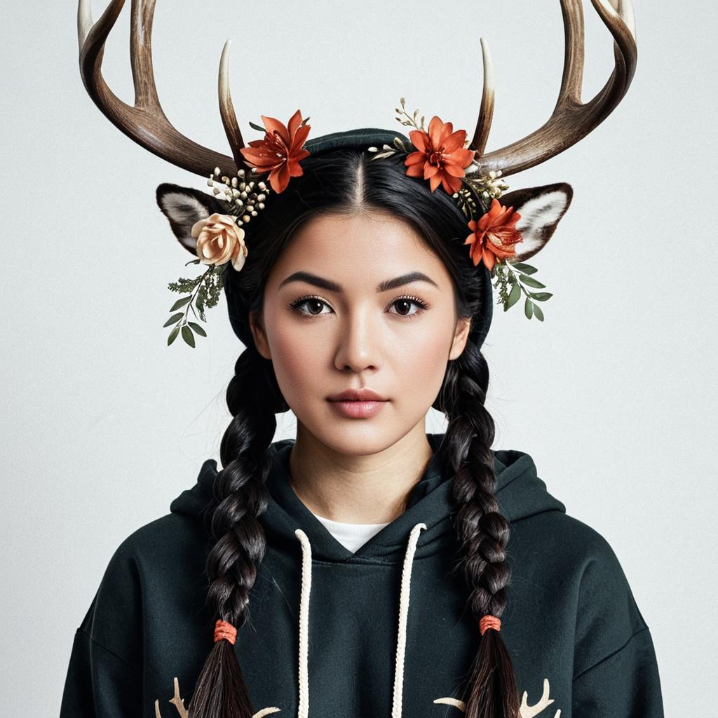 Portrait of a young woman wearing a festive reindeer antler headband with fake deer ears, dressed in a white and red furry outfit with a red heart on the chest. She has long brown hair styled in loose waves, red lipstick, and is posing against a plain black background.