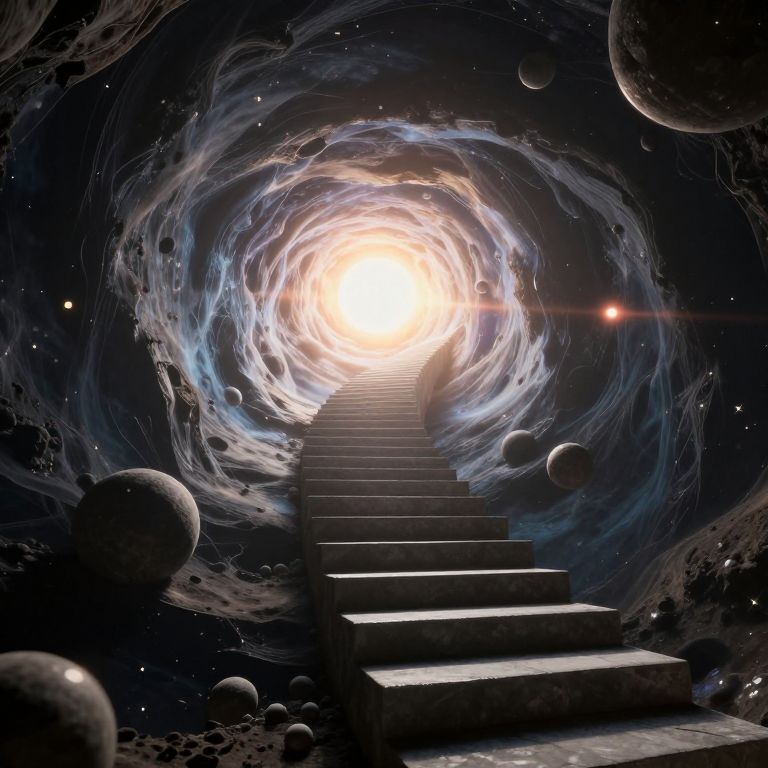 Digital artwork of a cosmic stairway ascending into a bright, glowing vortex, surrounded by swirling clouds, floating spheres, and a dark, starry background