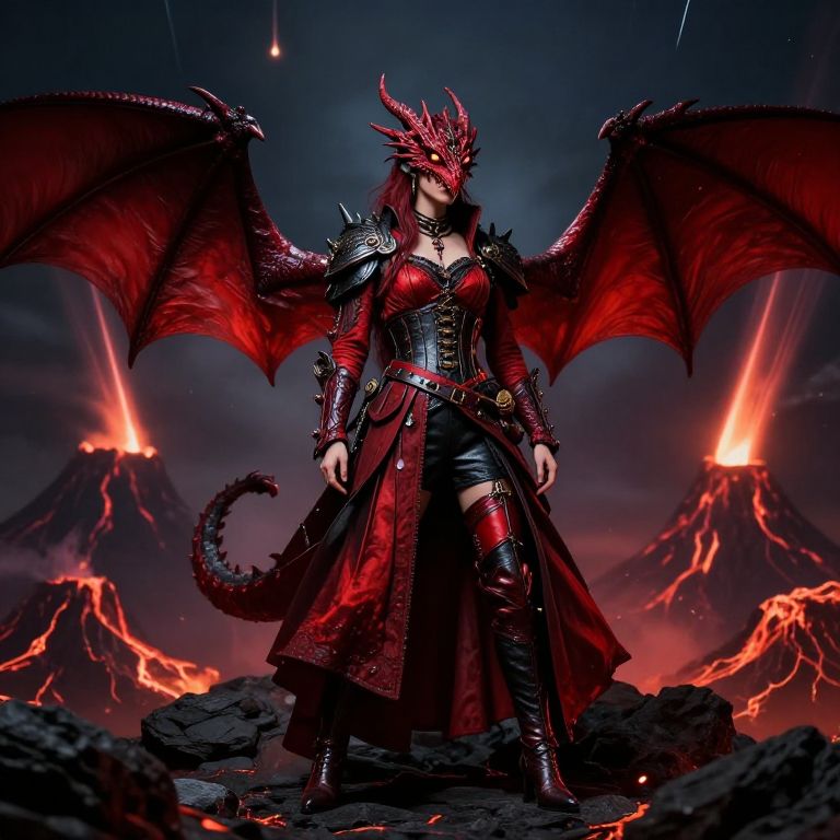 Steampunk Fashion a red and black dragon surrounded by a volcanic scene with meteors falling from the sky + cinematic + hyper detailed,