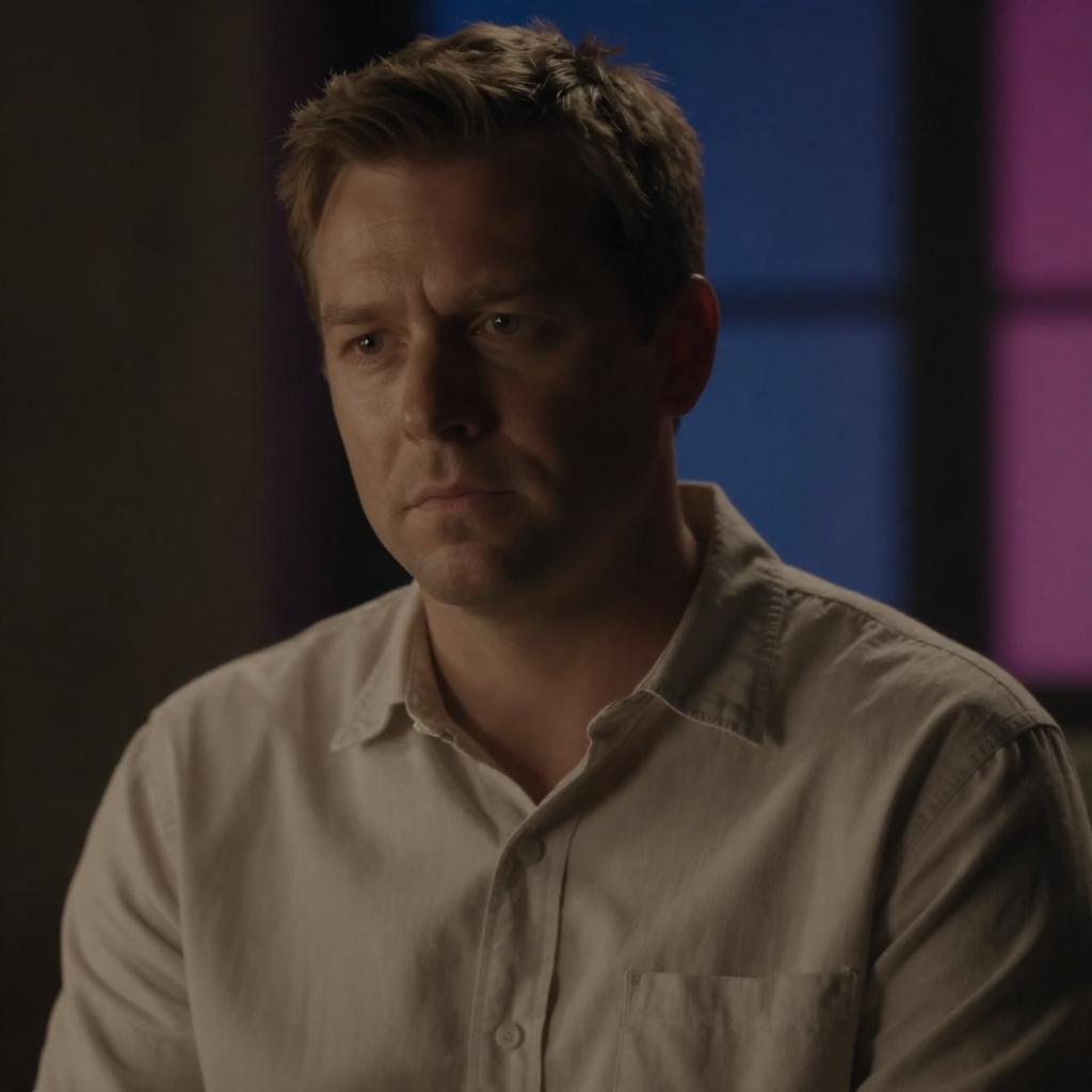 Photograph of a serious-looking man with light brown hair, wearing a beige shirt, dimly lit from the left. Background is dark with blurred blue and pink lights. Man's face partially shadowed, focused gaze. Medium close-up.