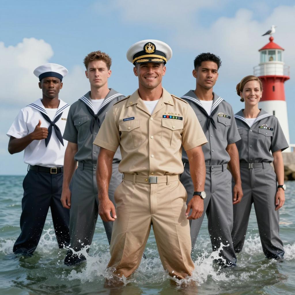 Six people standing in front of a submarine. Central figure, white male in white naval uniform, crossed arms, black hat. Four women in beige naval uniforms, one man in beige shirt and tie. Submarine's conning tower in background, two helicopters in sky. Ocean and clouds in background. People stand in a semi-circle, front row faces camera. Submarine conning tower with rounded edges, metal railing at bottom. Blue sky with white clouds.