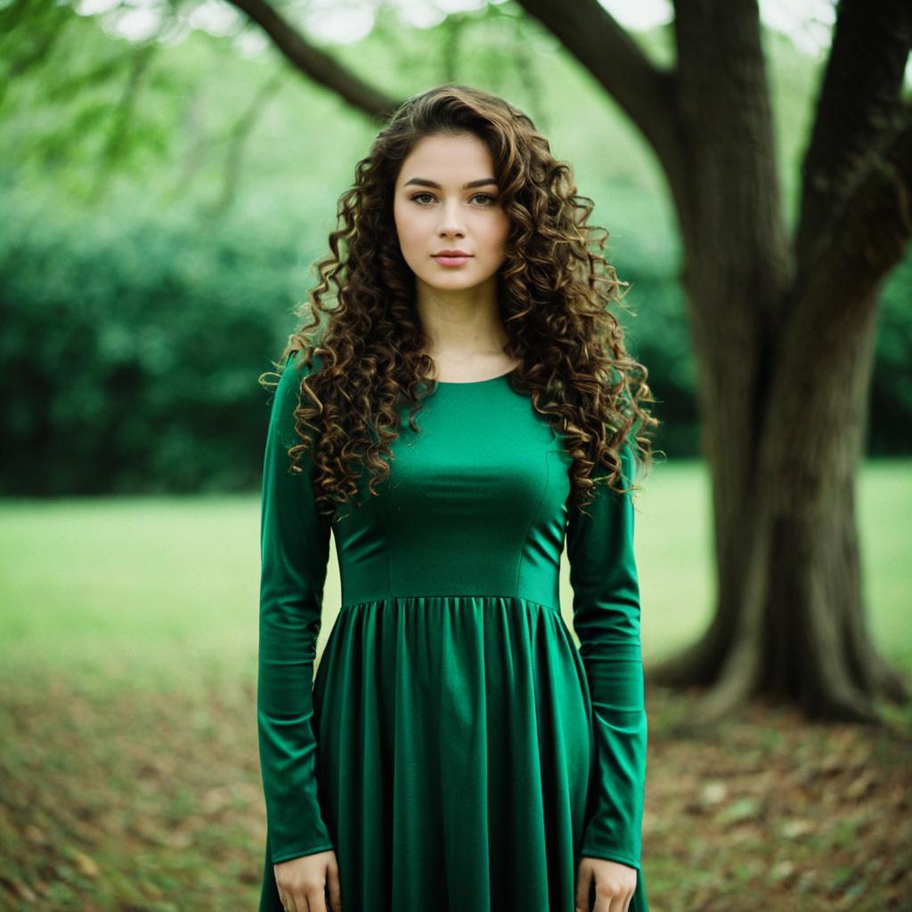 Beautiful emerald green,1girl, solo, green dress, dress, long hair, brown hair, blurry background, blurry, outdoors, looking at viewer, brown eyes, realistic, long sleeves, tree, standing, arms at sides, closed mouth, curly hair