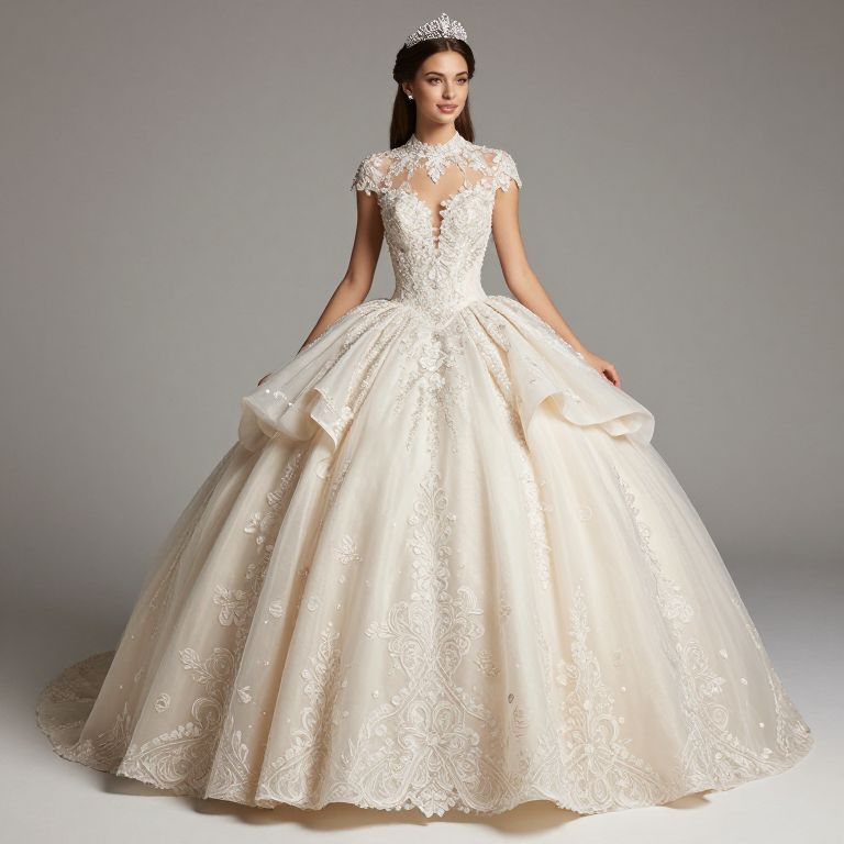 Young woman wearing an illusion high neck quinceanera dress with intricate lace embroidery, a full ball gown skirt, and delicate cap sleeves. The dress is a soft ivory color with detailed floral lace patterns and sheer neckline. The model wears a sparkling tiara and matching earrings, emphasizing the formal and celebratory style typical for a quinceanera event.