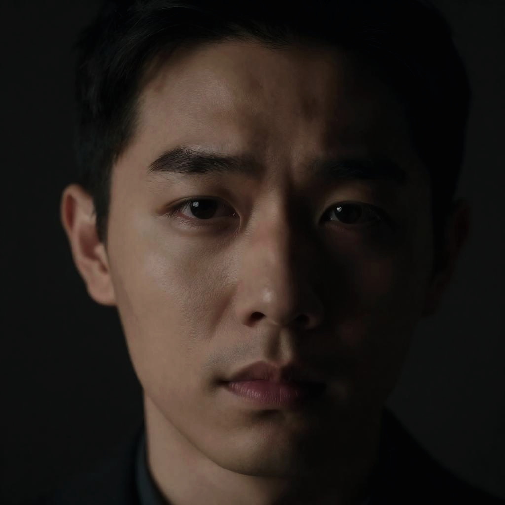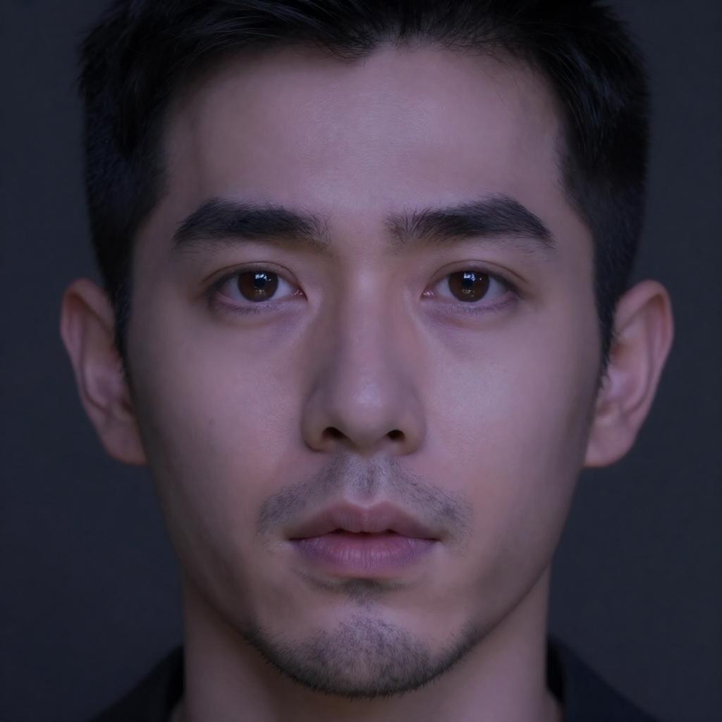 Digital portrait of a man with light purple skin, brown eyes, black hair, and a short beard. Intense gaze, slightly open mouth, dark background. Close-up, centered face.