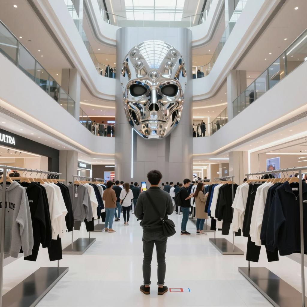 Mind Control Ultra modern retail clothes shop in a big mall, ultra modern design, architecture, an individual scans with his mobile phone a price label, big mall, in store big queue to pay, surreal, photorealistic, ultra modern, octane render, hyper - realistic, photography, ultra wide shot, 8k, hyper detailed,