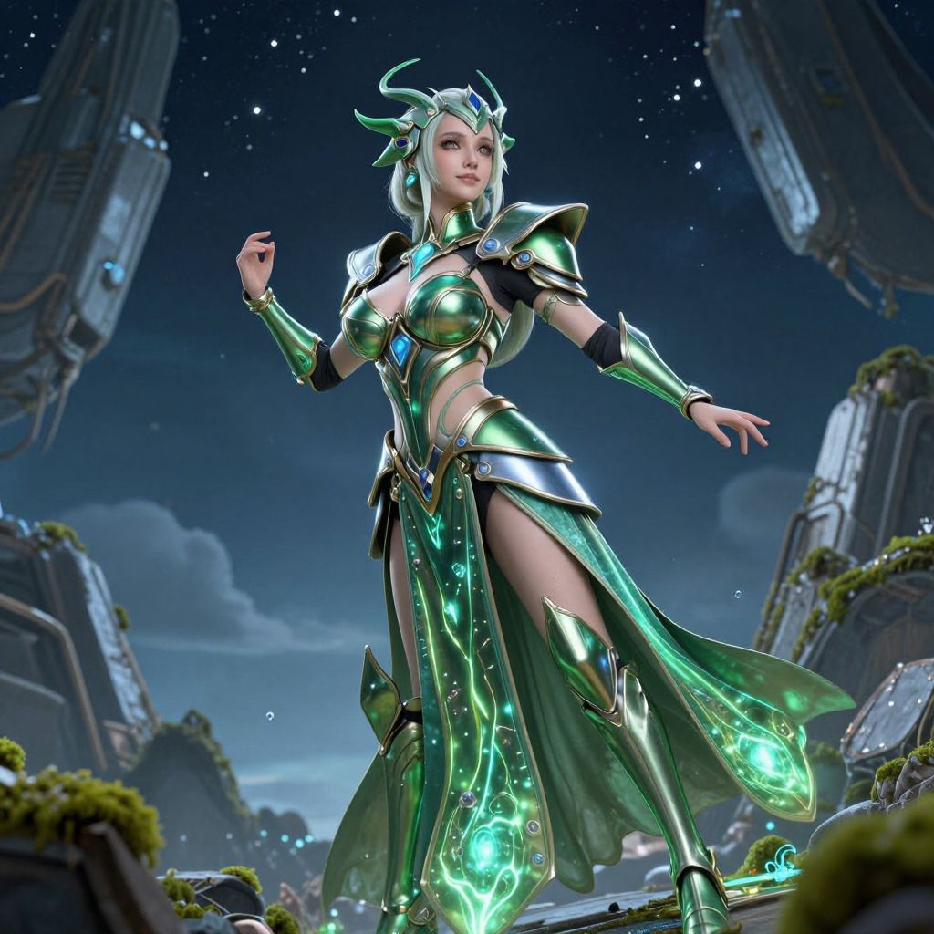 A dynamic scene of a woman in a futuristic alien empress costume composed of green metallic avant-garde elements, including shoulder armor and a flowing caftan with embedded energy veins, posing dramatically in a floating ruin beneath a starlit sky, her face is serene yet authoritative with a soft glow in her eyes, illuminated by ambient bioluminescent moss around her feet. The woman has big tits and cute face