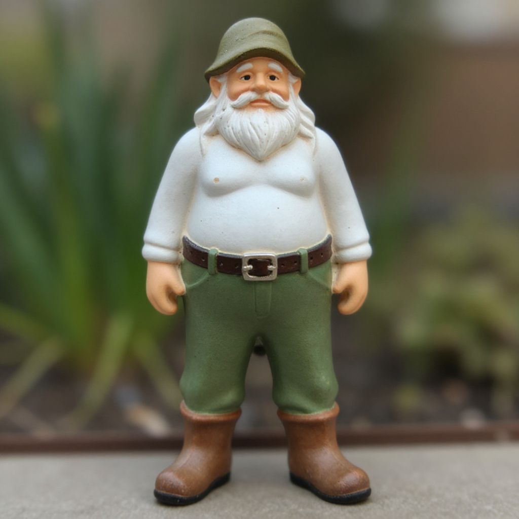 Photograph of a detailed garden gnome with a white shirt, green pants, brown boots, green hat, and white beard, standing on a concrete surface