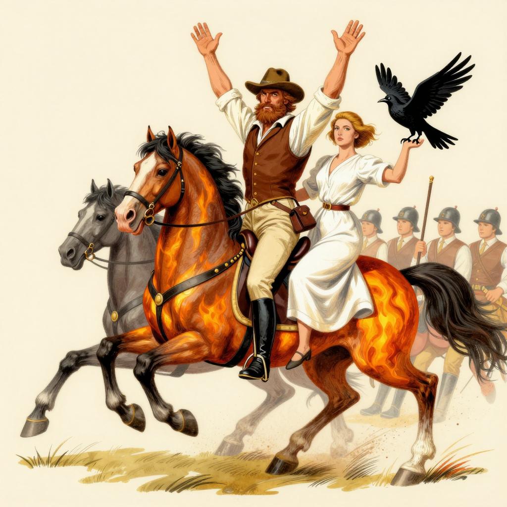Illustration of a bearded man with arms raised, wearing a brown vest and hat, standing on a fiery horse. Beside him, a woman in white with a black bird on her arm sits on the horse's back. Below, several mounted soldiers charge forward. The background is a pale yellow. The man's expression is intense, while the woman's is neutral. The horse's mane and tail are fringed. The illustration uses bold colors and dynamic poses.