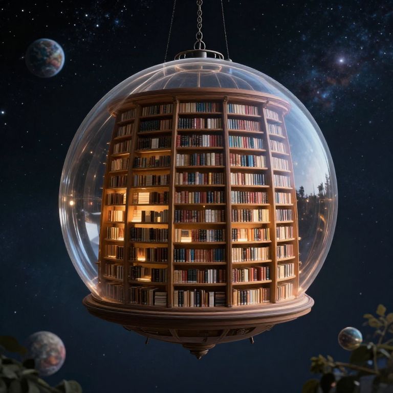 A serene library, encased in a luminous glass bubble, hovers serenely above a cosmic landscape, its windows aglow with the warmth of knowledge against the infinite expanse of stars and distant worlds.