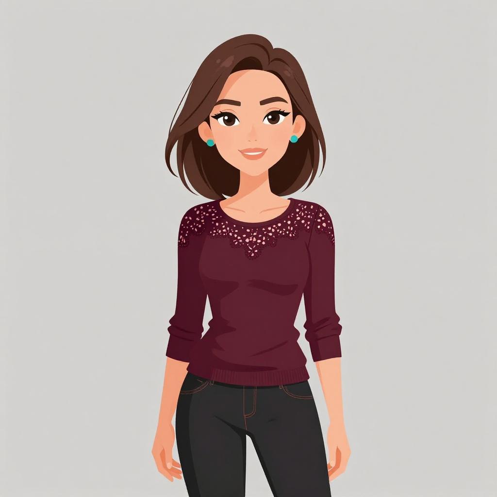 Illustration of a young woman with shoulder-length brown hair and brown eyes, smiling confidently. She is wearing a burgundy long-sleeved top with lace detailing on the upper chest and sleeves, paired with black skinny jeans. She accessorizes with turquoise stud earrings. The background is plain light gray.