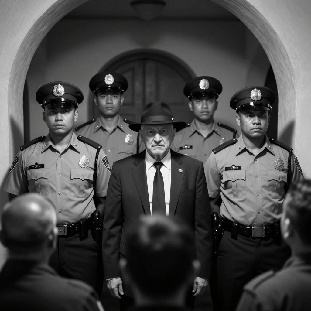 Black-and-white photo showing a tense moment with several policemen in uniform surrounding a seated man in a suit who is reading a document. One policeman places a hand on the man's chest, while other men in suits and hats stand in the background. The scene includes a table with papers in the foreground and a crowd observing in the background.