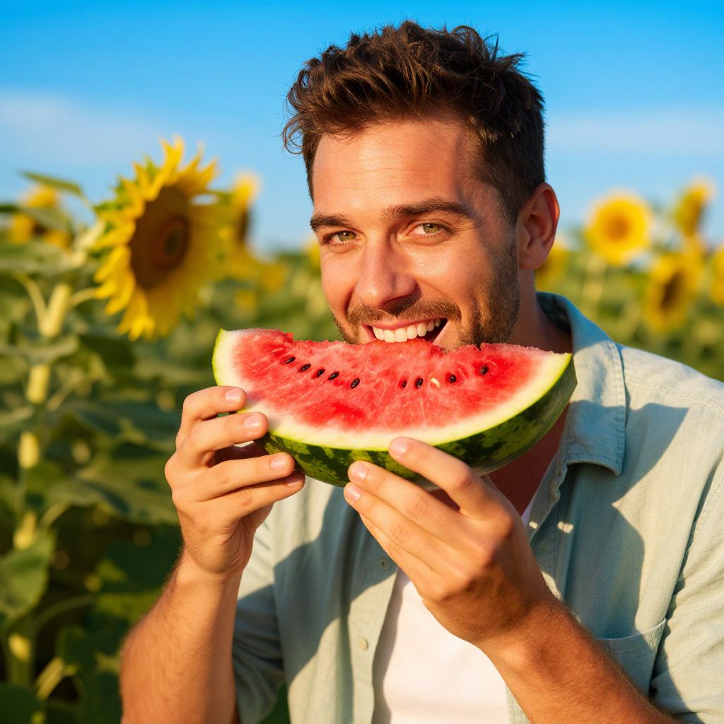 Photograph of a young, handsome man with curly brown hair and light brown eyes, wearing a dark blue V-neck T-shirt. He is holding a glass filled with a layered drink, featuring green at the top, orange in the middle, and red at the bottom, with a straw. He is sipping the drink while sitting in a brightly lit, indoor setting with greenery and yellow flowers in the blurred background. The image has a vivid, slightly enhanced color style, giving it a lively and refreshing feel.