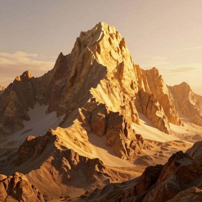A majestic 3D-rendered mountain bathed in the warm glow of golden-hour sunlight, its rugged peaks and valleys reshaped by the interplay of light and shadow, evoking a surreal, almost otherworldly atmosphere reminiscent of a digital landscape where poetry and nature converge.