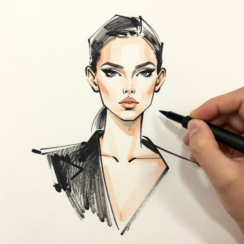 Make drawing from photo inspired image, fashion portrait rendered as digital ink sketch with minimalistic color accents, showcasing elegant line work, subtle shadows and textures on fabric, modern style with emphasis on facial features and expression, sleek and artistic.
