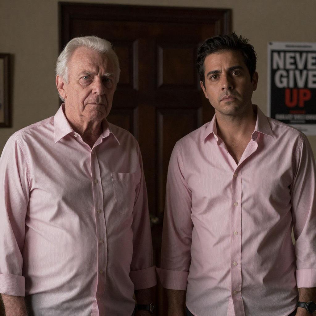 Photograph of two men in a dimly lit room. Older man with white hair, wearing a pink striped shirt, stands left. Younger man with dark hair, wearing an unbuttoned pink striped shirt, stands right. Both look serious. Background has dark wooden door and "Never Give Up" poster.