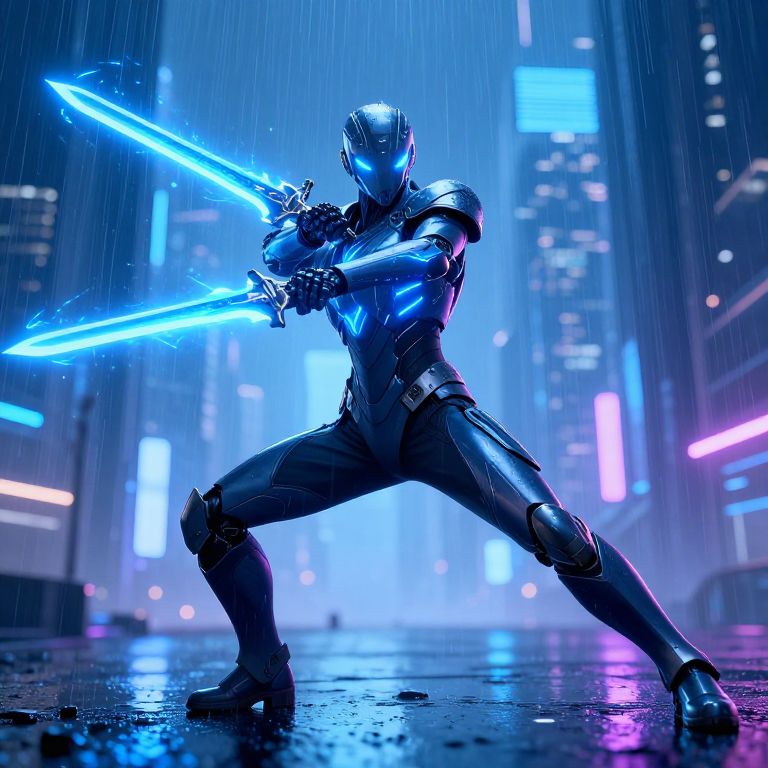 Futuristic dynamic dual sword pose of a cybernetic warrior in sleek armor, energy swords pulsing bright blue, futuristic cityscape glowing behind, rain falling and neon reflections on wet surfaces, powerful and agile stance conveying readiness for combat.