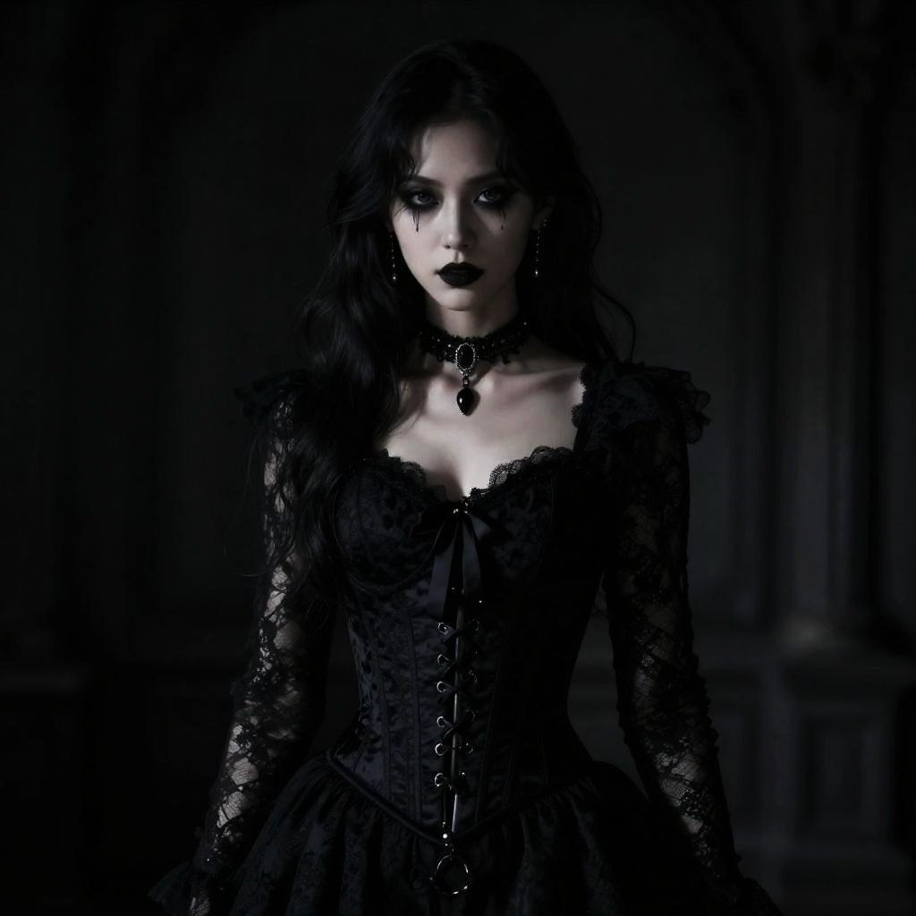 (photorealistic:1.4), , low-key lighting, moody ambiance, dark shadows, mysterious aura, gothic style, dark clothing, black lace, corsets, velvet, chokers, dramatic makeup, brooding accessories, mysterious aura