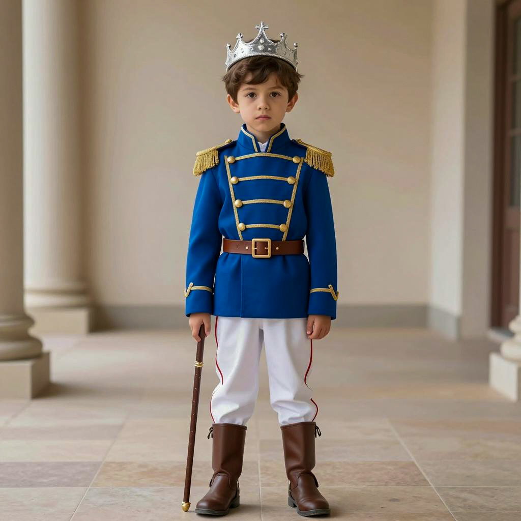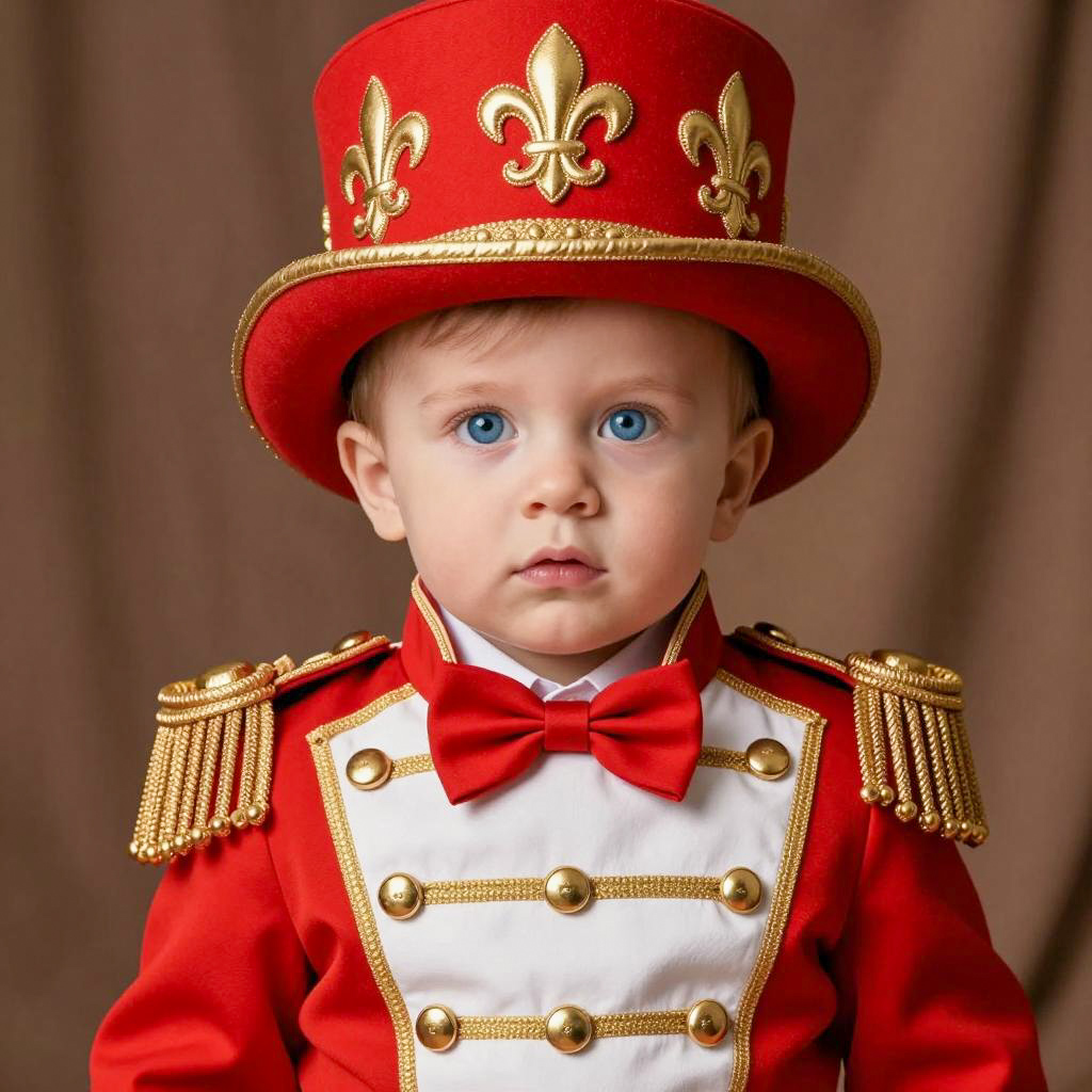 Circus ringmaster infant, photo of a young child with light brown skin and large blue eyes, wearing a detailed red and white military-style outfit with gold epaulettes and buttons, red bow tie, and a red top hat with gold fleur-de-lis decorations, soft lighting, brown draped background, realistic portrait style, detailed ures and colors, SD/T2I generated image, child-centered, regal and elegant, formal attire, slight expressionless look, symmetrical composition