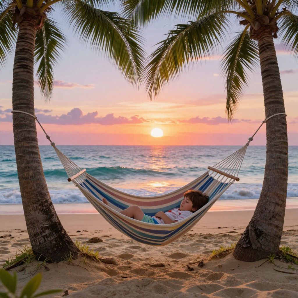 Dormido child napping contentedly in a hammock strung between two tall palm trees on a tropical beach, gentle ocean waves and a vibrant sunset painting the background, colorful, dreamy and tranquil digital art scene.
