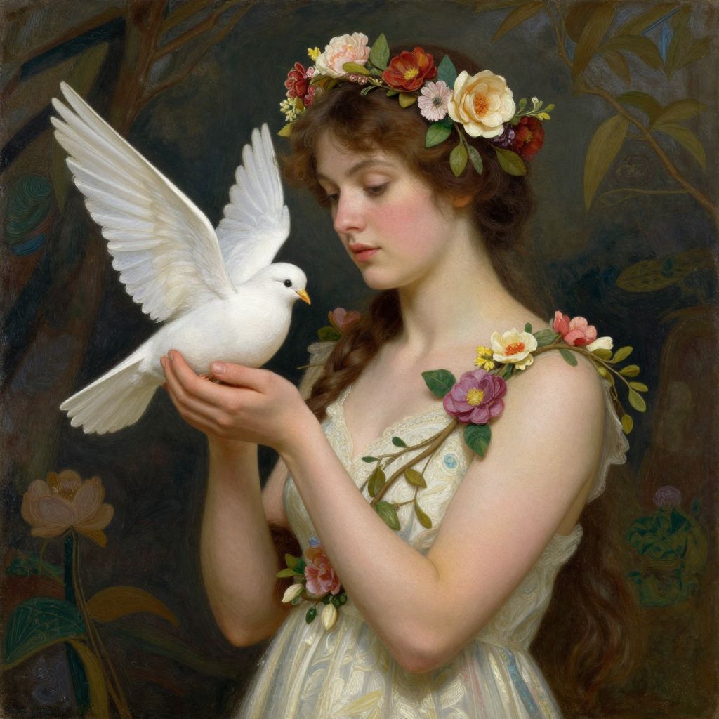 A woman adorned with floral and vine decorations holds a dove, surrounded by nature, reminiscent of Josephine Wall's art style.
