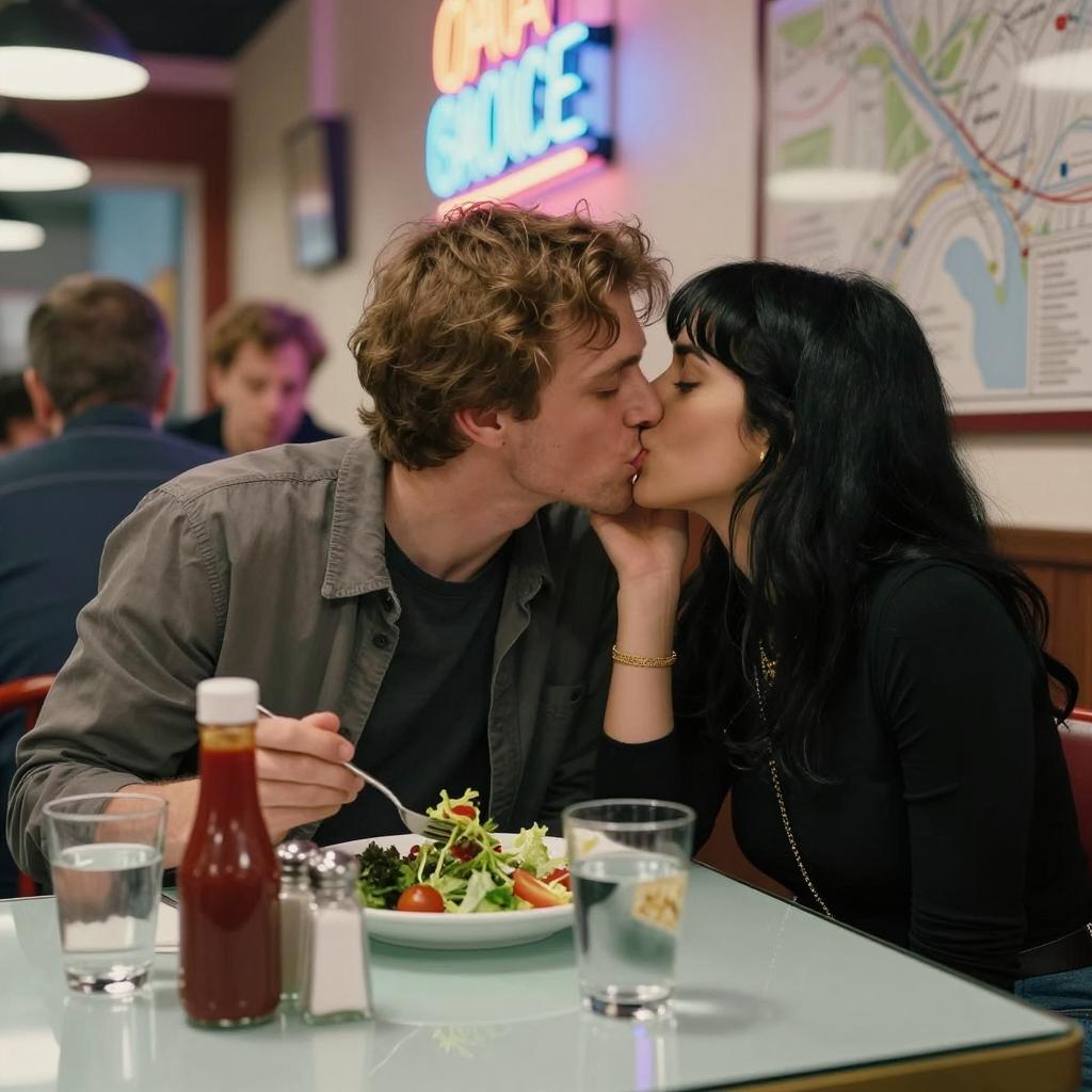 A photograph of a man and woman kissing at a restaurant table. The man has light brown hair, wears a gray jacket, and eats salad. The woman has long black hair, wears a black top, and leans towards him. Table has glass, ketchup bottle, salt shaker, and water glasses. Neon light in background. Two people in background, one blurred. Map on wall.